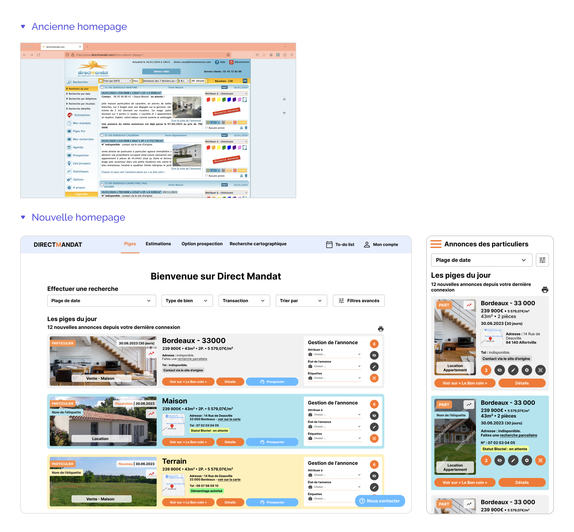 Le client Direct Annonces a souhaité réaliser une refonte de son site Direct Mandat, site internet créé en 2008 et qui propose une centralisation de piges immobilières pour les agents immobiliers indépendants et les agences immobilières.