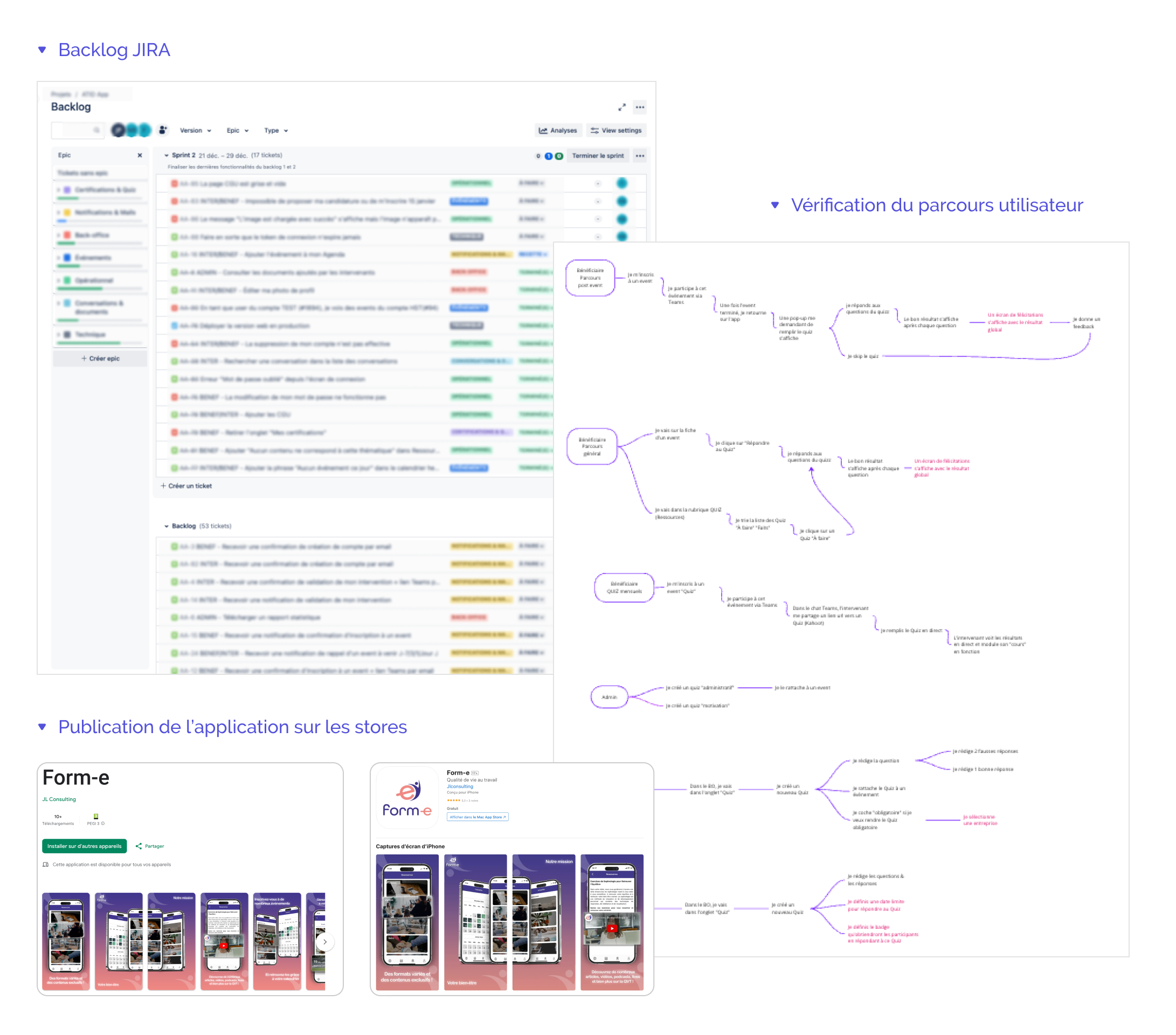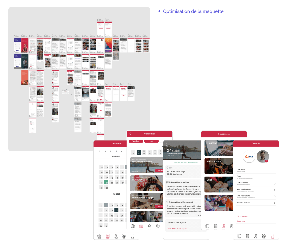 La première phase a consisté à identifier les promesses & FCS de l’offre, les utilisateurs et à rédiger les user stories. La maquette FIGMA ayant déjà été réalisée à mon arrivée, j’ai vérifié la pertinence des parcours & réalisé des ajustements : simplification, réparations, optimisations.